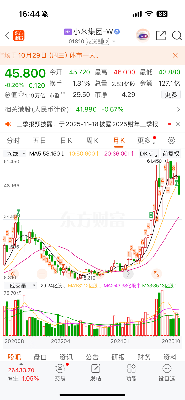 从当前月K线走势看,小米股价确实处于阶段性调整,但均线系统(MA5/10/20)