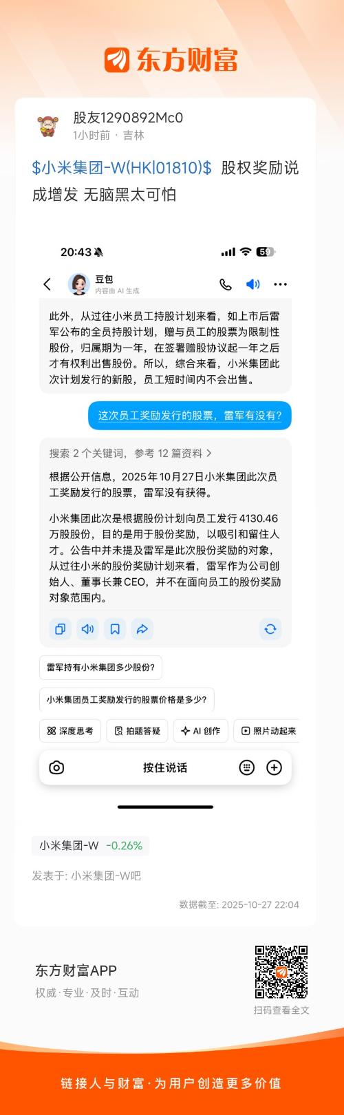 $小米集团-W(HK|01810)$  股权奖励说成增发 无脑黑太可怕