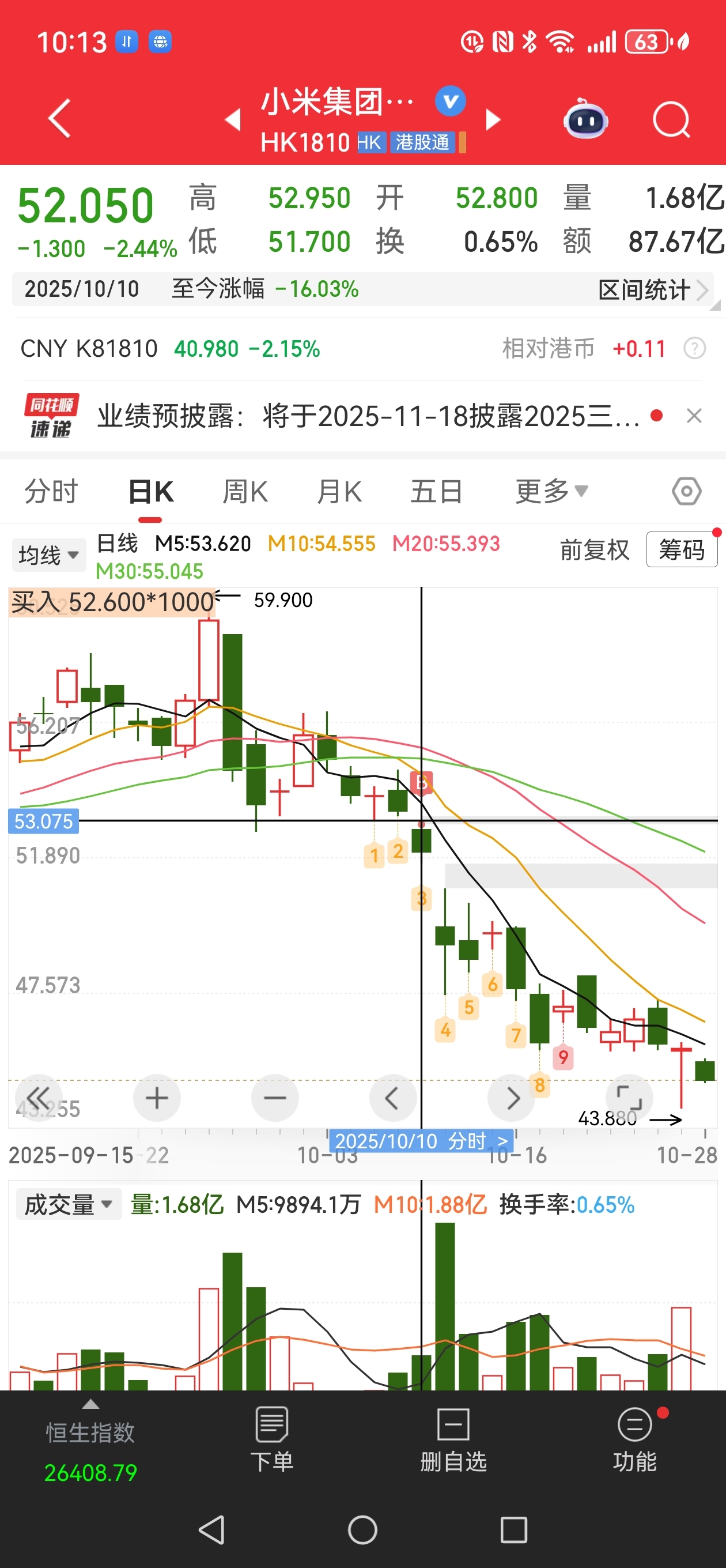 我在小米集团52.50块的时候补过仓,至今跌了16个点,我仍不建议大家补仓。放量