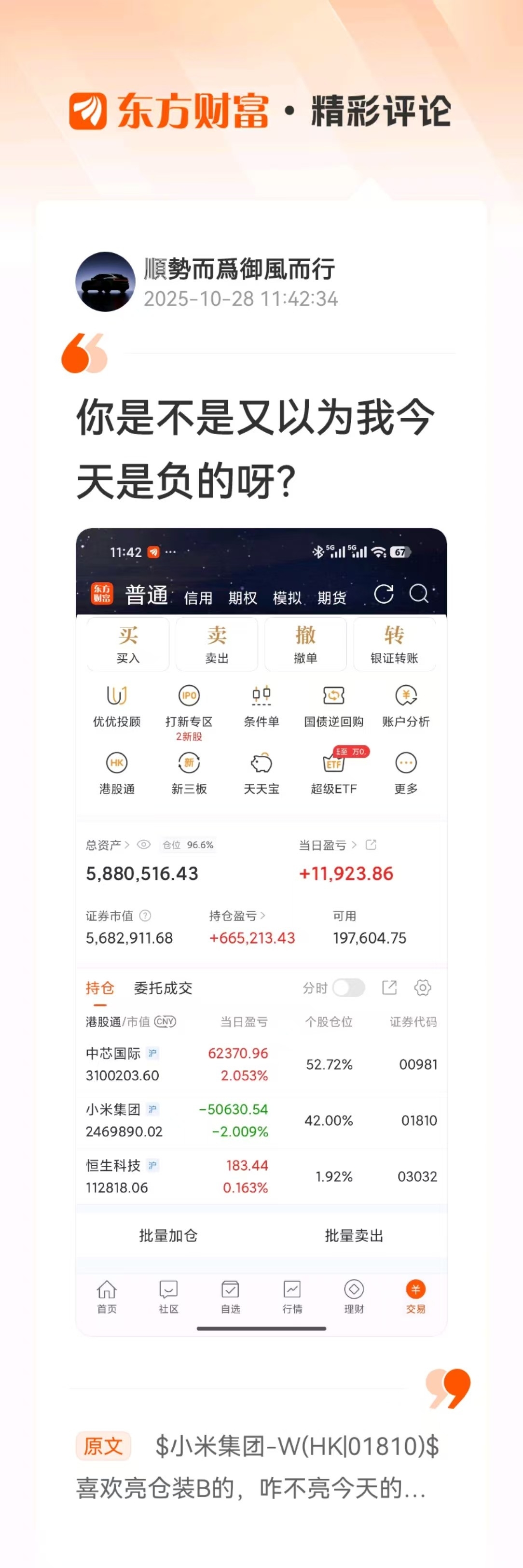 $小米集团-W(HK|01810)$ @顺势而爲御风而行 中芯跳水了,你亮个今天赚大钱给我看看。