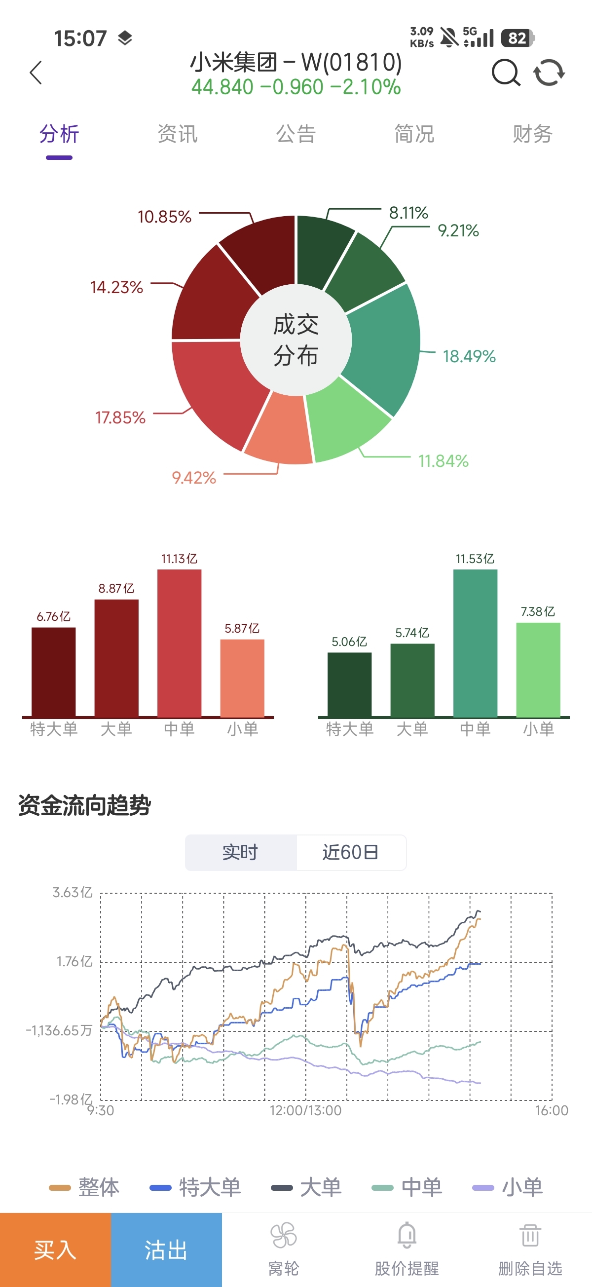 $小米集团-W(HK|01810)$ 大单,超大单买入,小单卖出