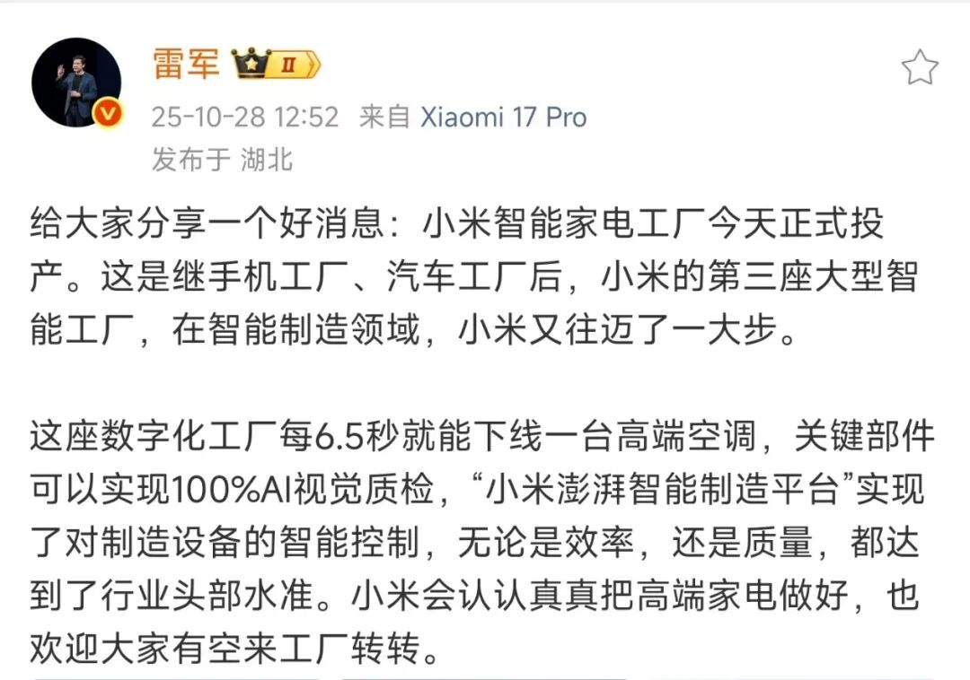 雷军在微博上表示,小米智能家电工厂正式投产,这意味着小米在智能制造领域又往前迈了一大步。小米智能家电工厂每6.5秒就能下线一台高端空调,关键部件可以实现100%AI视觉质检,“小米澎湃智能制造平台”实现了对制造设备的智能控制,无论是效率,还是质量,都达到了行业头部水准。