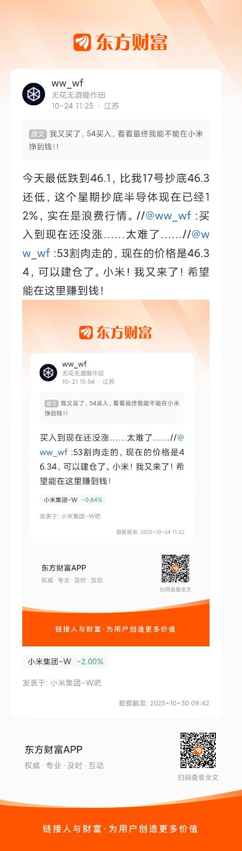 目前最低43.7,比我的成本46.3已经亏掉2.6了,撑不住了,再见40以下,再看吧……//@ww_wf :今天最低跌到46.1,比我17号抄底46.3还低,这个星期抄底半导体现在已经12%,实在是浪费行情。//@ww_wf :买入到现在还没涨……太难了……//@ww_wf :53割肉走的,现在的价格是46.34,可以建仓了。小米!我又来了!希望能在这里赚到钱!
