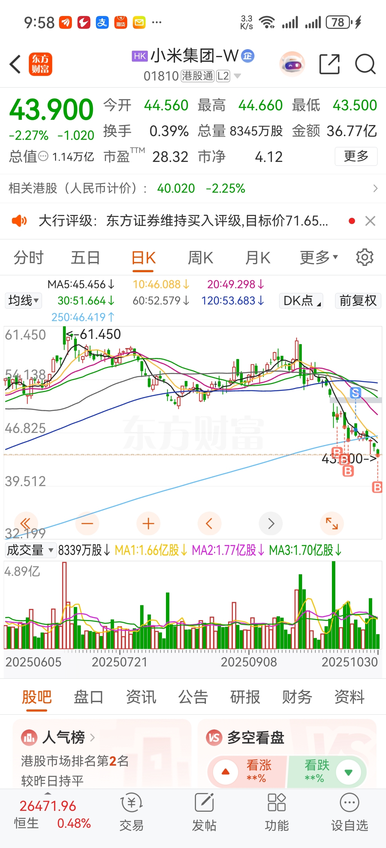 $小米集团-W(HK|01810)$ 第1次止损了。再来。