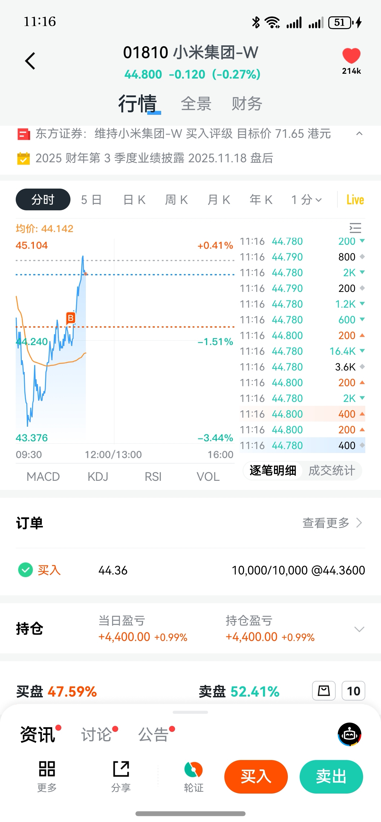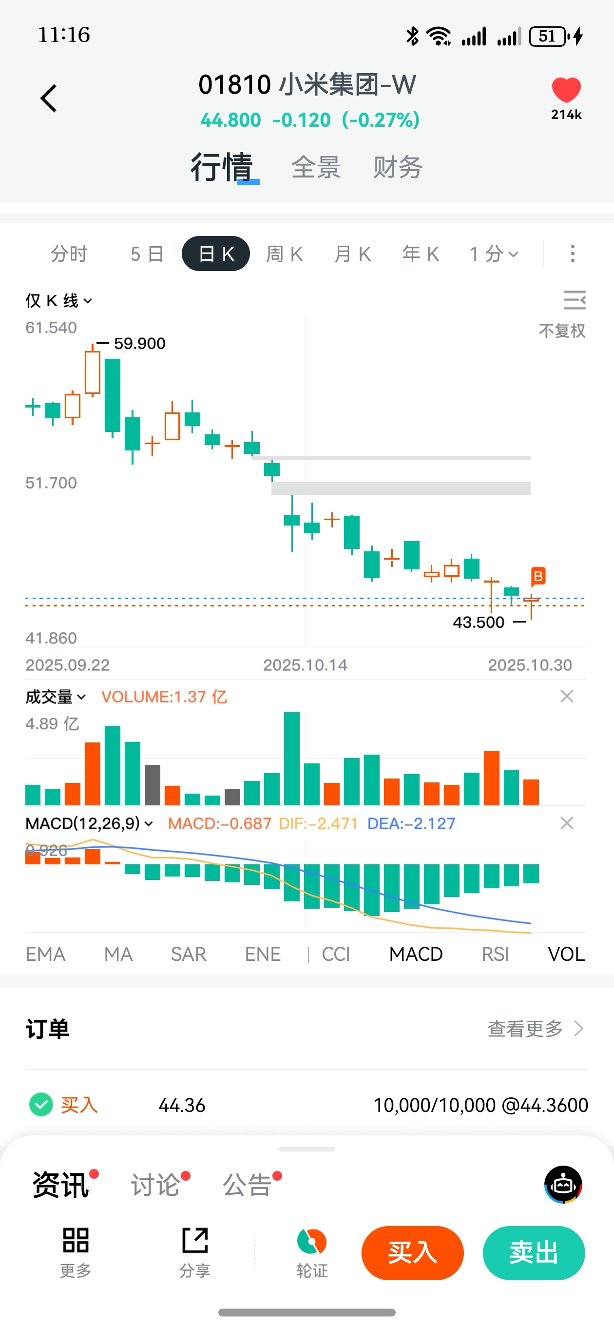 加油啊雷总!网上的舆论就是为了打压股价,我感觉44+已经是阶段性底部了。果断出手