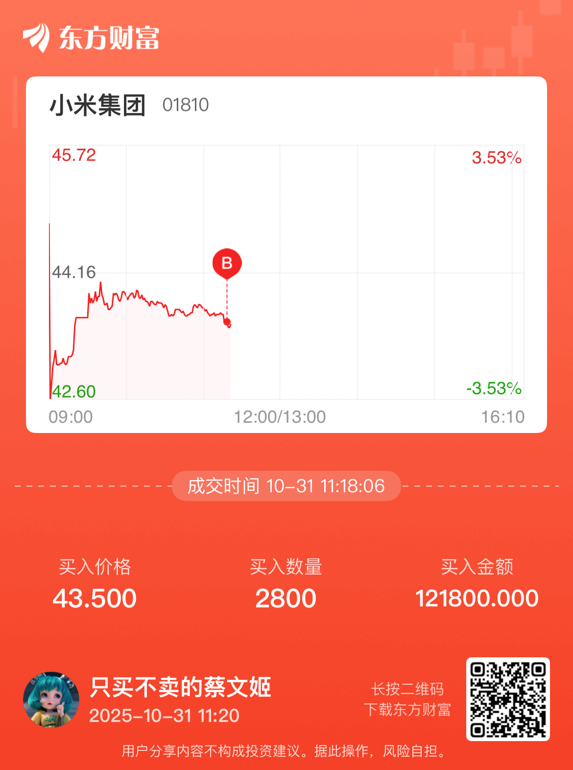 温馨提示: 1.根据《证券法》规定,禁止编造、传播虚假信息或者误导性信息,扰乱证券市场;2.用户在本社区发表的所有资料、言论等仅代表个人观点,与本网站立场无关,不对您构成任何投资建议。用户应基于自己的独立判断,自行决定证券投资并承担相应风险。《东方财富社区管理规定》