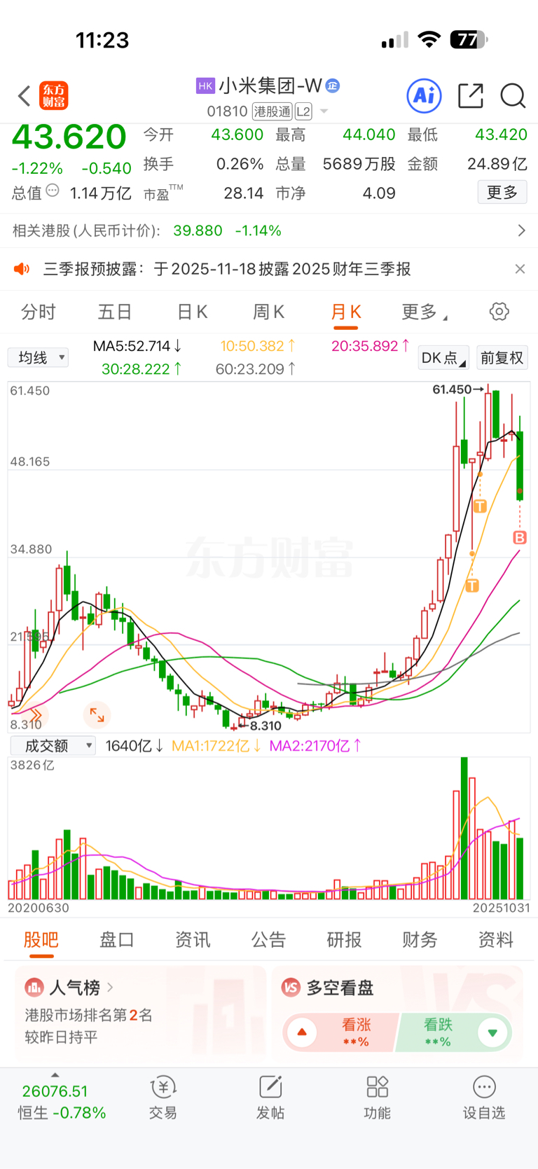 $小米集团-W(HK|01810)$ 看月线图,11月还得跌一下,40支撑位