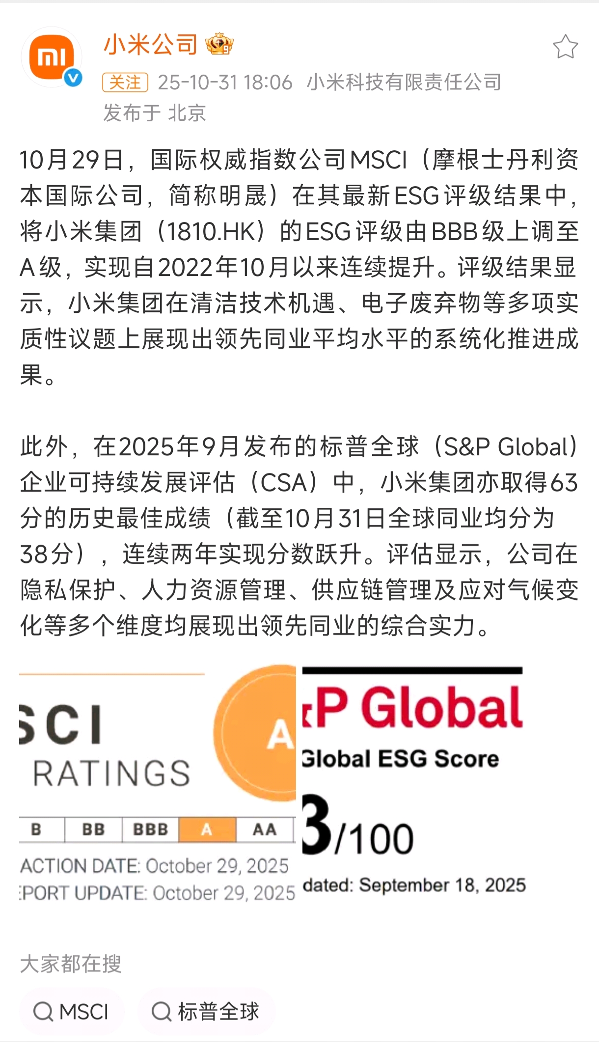$小米集团-W(HK|01810)$ 明晟上调小米ESG评级至A级