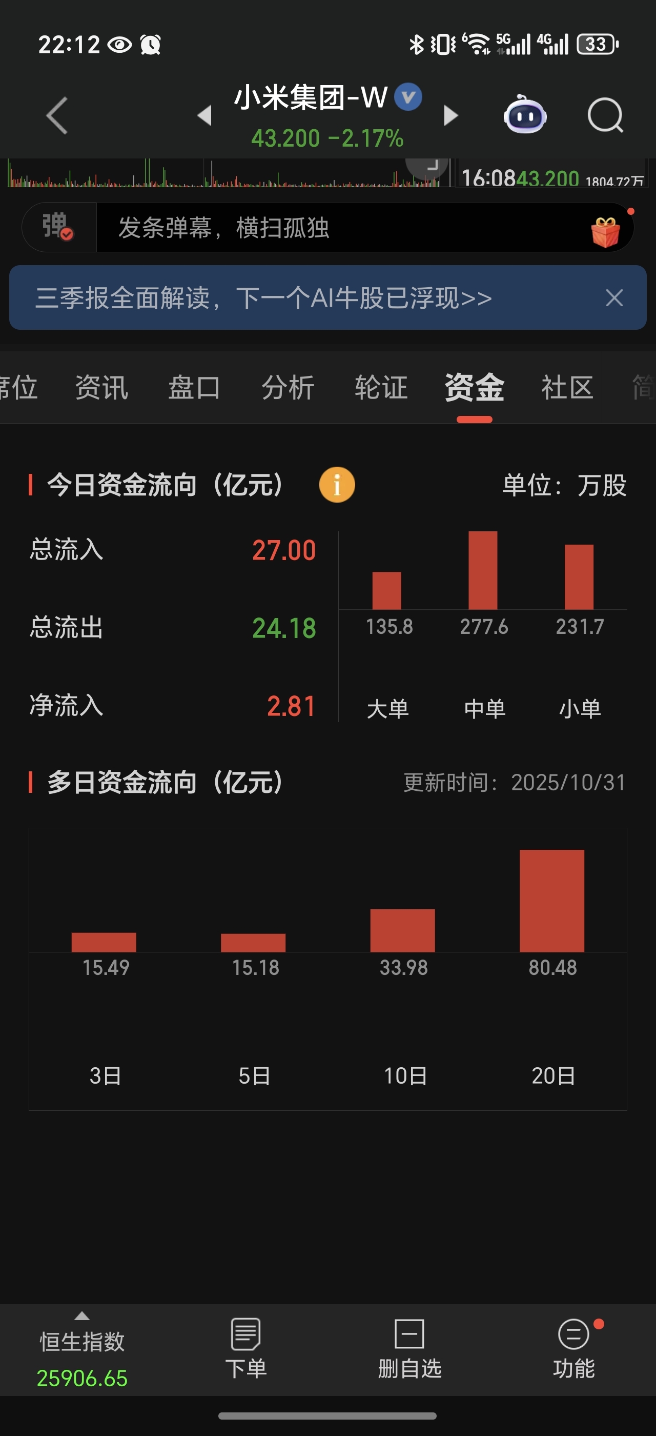 $小米集团-W(HK|01810)$ 单纯从股票操作上看,这次下杀是机构借助互联网流量操作股价的典型案例,20日下杀了25个点,进了80个亿的资金,被洗掉的恐慌盘获利都落入机构囊中,能时机成熟再从空做多再赚一波,被洗掉的散户又会拍腿大叫