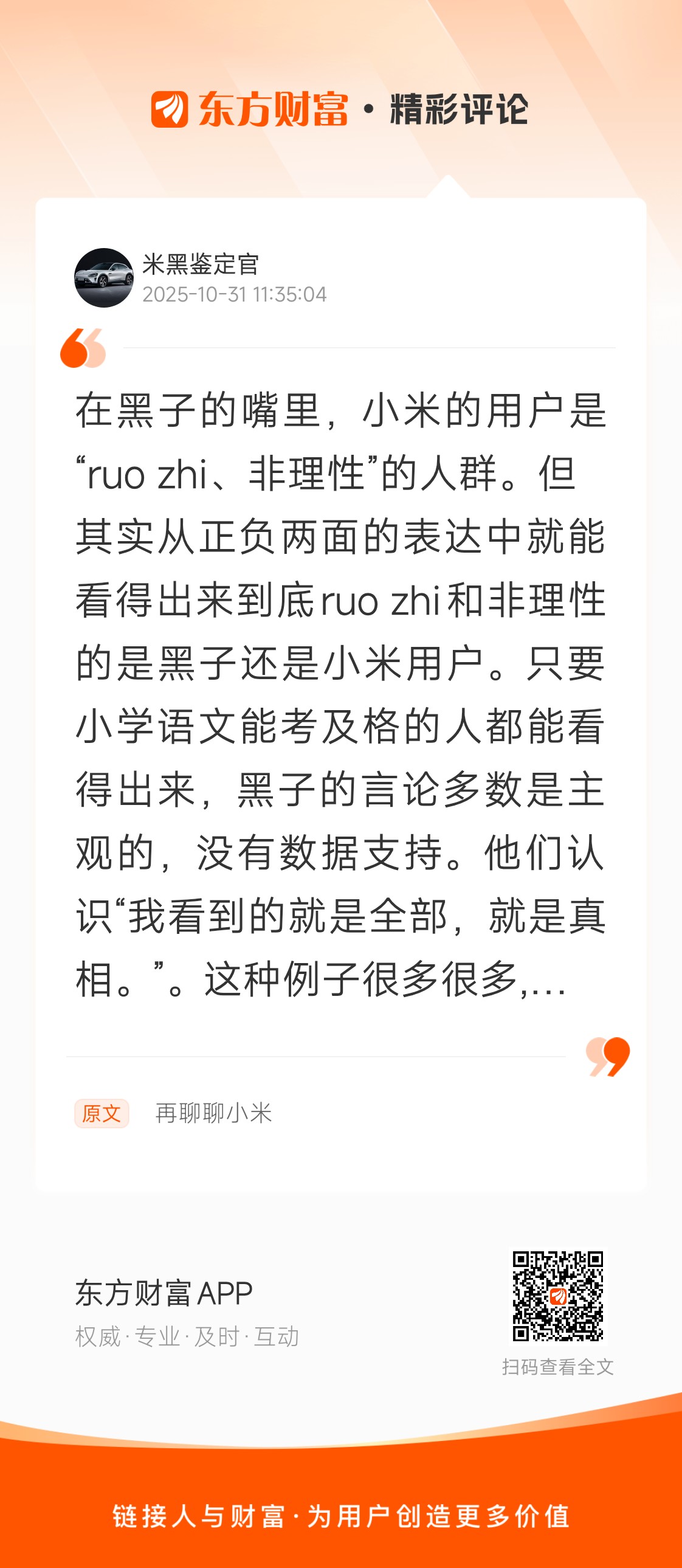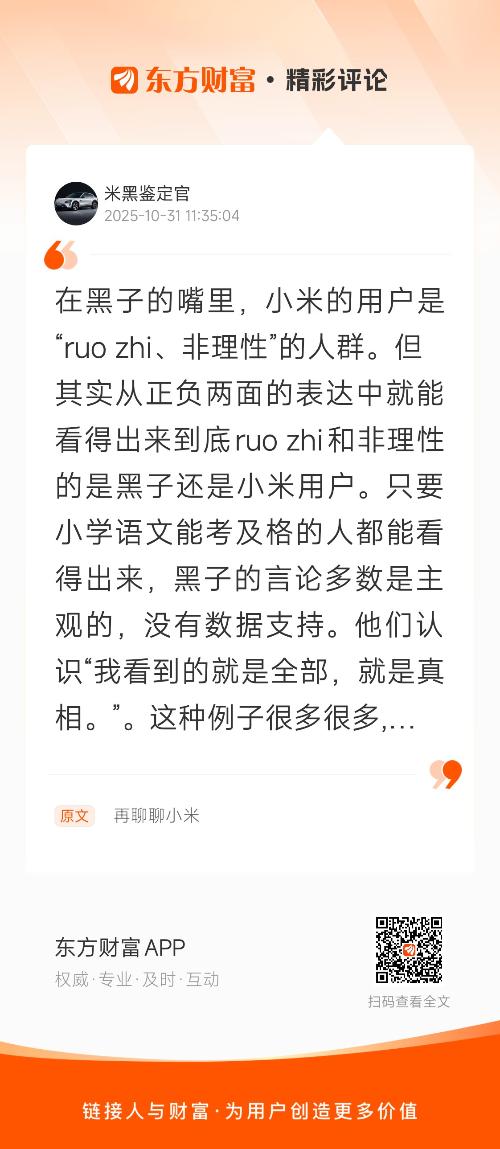 在黑子的嘴里,小米的用户是“ruo zhi、非理性”的人群。但其实从正负两面的表达中就能看得出来到底ruo zhi和非理性的是黑子还是小米用户。只要小学语文能考及格的人都能看得出来,黑子的言论多数是主观的,没有数据支持。他们认识“我看到的就是全部,就是真相。”。这种例子很多很多,我随便说几个:1.买了一个小米的产品坏了,就是一句:小米的产品垃圾。请问:哪家的产品是100%零故障的?2.看到小米用高通芯片,就是一句:小米是买办企业。请问:高通的客户只有小米吗?3.看到小米的注册地在开曼群岛,就是一句:小米不是中国企业。去了解一下还有哪些企业也在那里注册?4.抖音上刷几个小米汽车的事故,就是一句:小米汽车事事故多。请去了解一下官方发布的各大车企事故率数据是多少?5.听别人截了一句雷军的“200公里瞬间刹停”,就是一句:小米夸大营销。请去看看原视频,了解一下上下文。如果可以这样段章取义,那友商的汽车安全说是“想撞都难”、SUV说是“1000万以内最好的SUV”、手机价格说是"谁都买得起"你们又该怎么理解?6.看到“空调外机是赠品”,就是一句:小米10年保修不包含外机,因为外机是赠品。请问你们这种智商是怎么活到现在的?7.看到小米汽车事故打不开门,就是一句:小米汽车不安全。请问是小米所有的故事都打不开门吗?同时又有哪家车企能保证高速碰撞后门一定能正常打开?8.看到小米的宣传海报中有”小字“,就是一句:小字营销。请问别人能干且不违法,为什么小米就不能干?还有很多很多,懂得都懂! 我在《再聊聊小米》的评论获得了大家的关注。