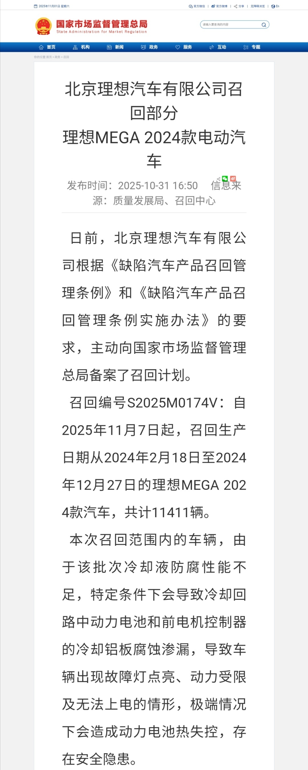 $小米集团-W(HK|01810)$ 新华财经北京10月31日电(康耕甫) 10月31日,理想汽车发布公告,由于该批次冷却液防腐性能不足,理想汽车宣布主动 召回 2024年2月18日至2024年12月27日期间生产的11411辆理想MEGA汽车,此次召回不涉及其他车型,理想汽车将为召回车辆车主免费更换全新动力电池及相关配套设备。