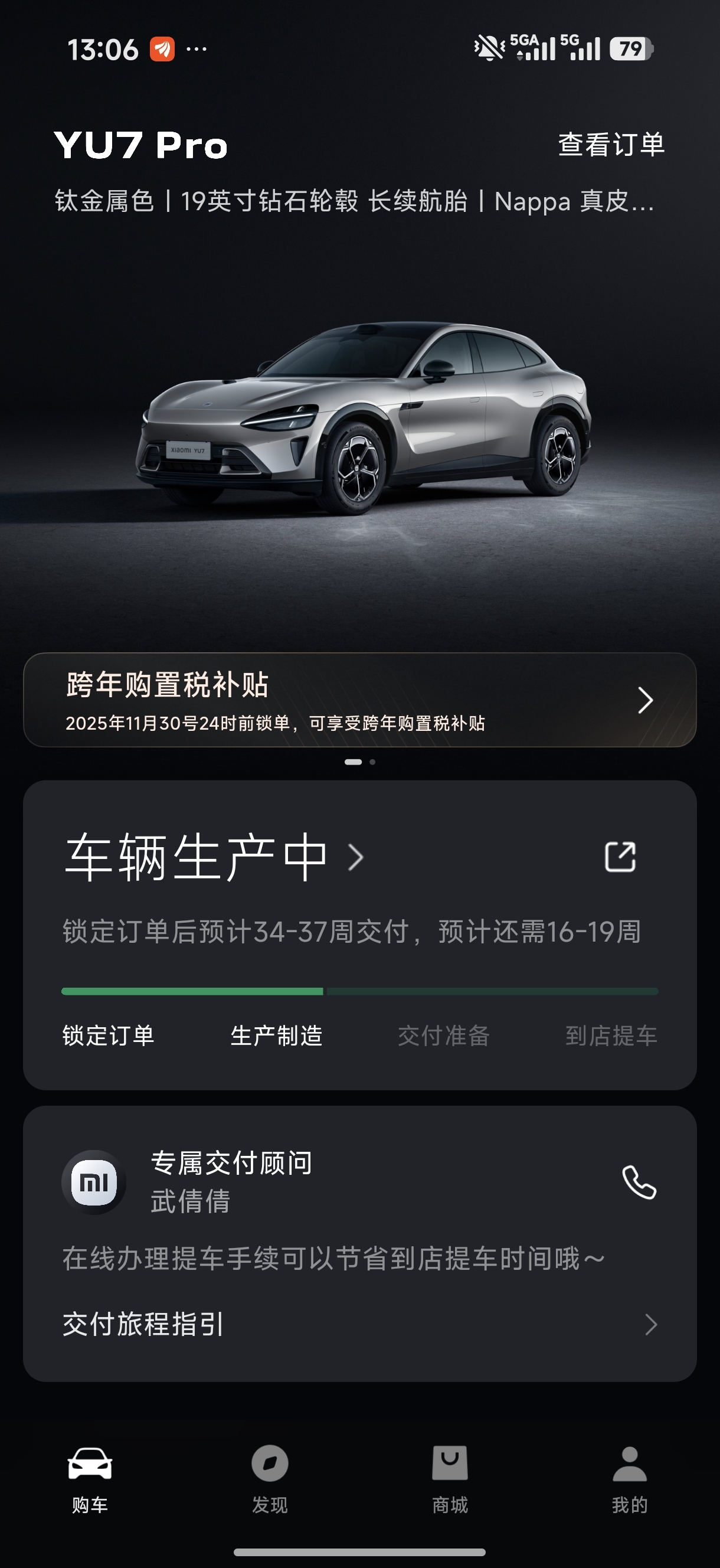 今天早上我的小米yu7显示提车时间16-19周,昨天还是显示23周-27周!二期