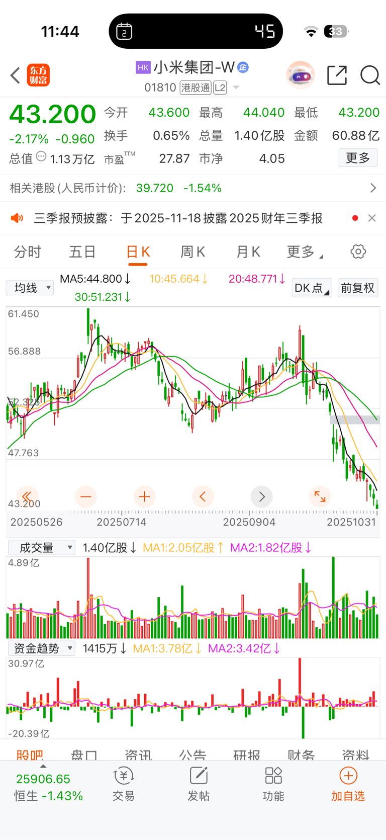 $小米集团-W(HK|01810)$ 这个图上面套了不少人很多人想幻想稍微拉一下亏一半就想卖,谁会去拉除非主力是慈善家给你们解套要么在打底一点下面接筹码风险大于利润了
