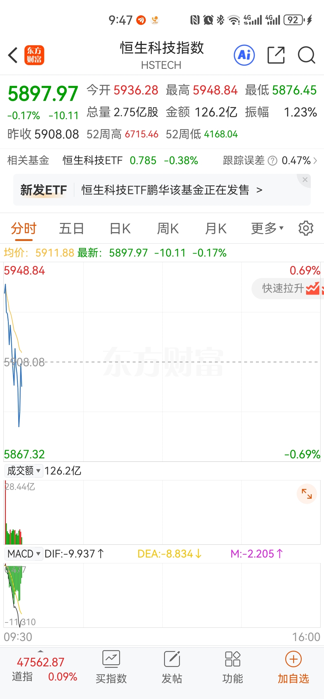 恒科跳水,A股也不好,今天上升阻力大,保持到1.5个点以上就不错了。