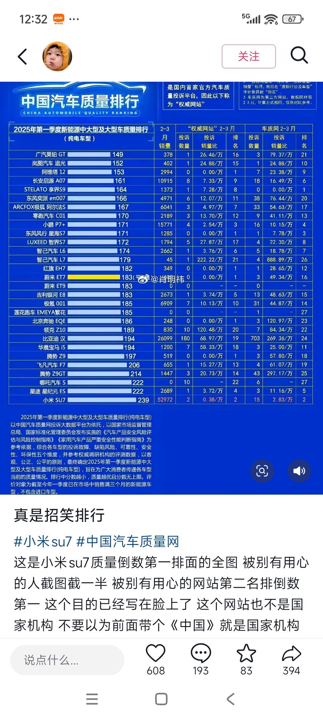 中国汽车质量排行榜小米su7排名第2