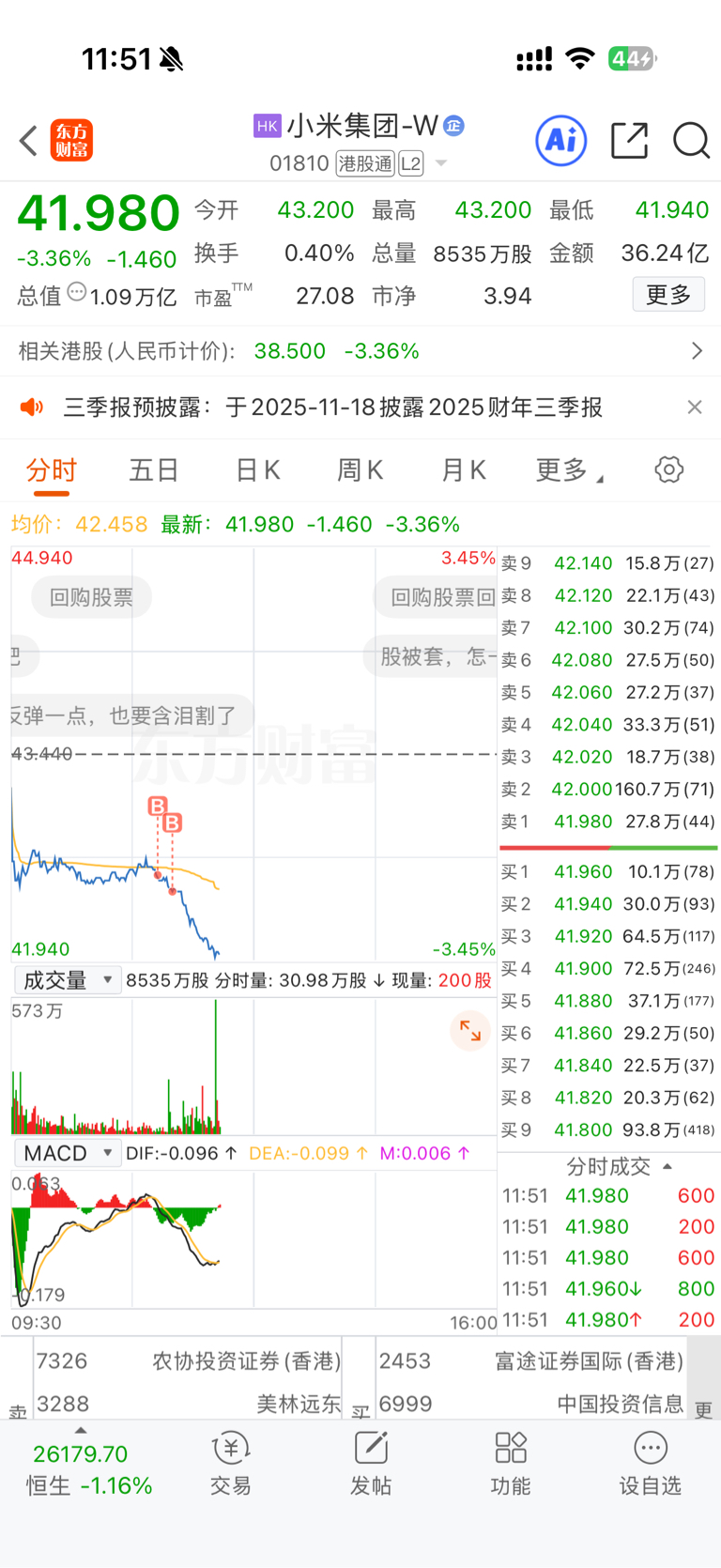 $小米集团-W(HK|01810)$ 小米一战,我已全面溃败,外资做空赢了,下次补仓等40再接吧,兄弟们我扛不住了
