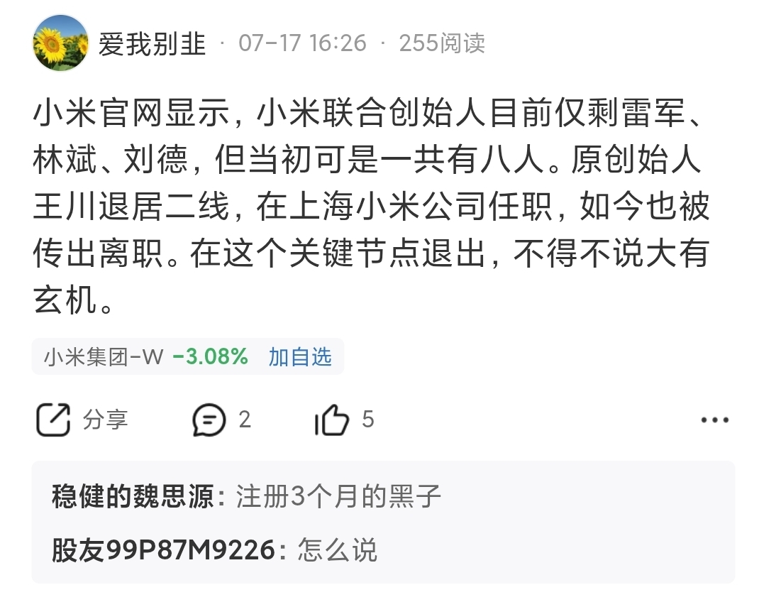 $小米集团-W(HK|01810)$ 德玛西亚有句老话:“人在,塔在。”7月17日,我在股吧发帖:创始团队的王川在退居二线的情况下,再次离职。后来几个月内,高管离开的新闻也有几则,比如王腾的事情就莫名其妙。因此,今天的一切,早有预兆。