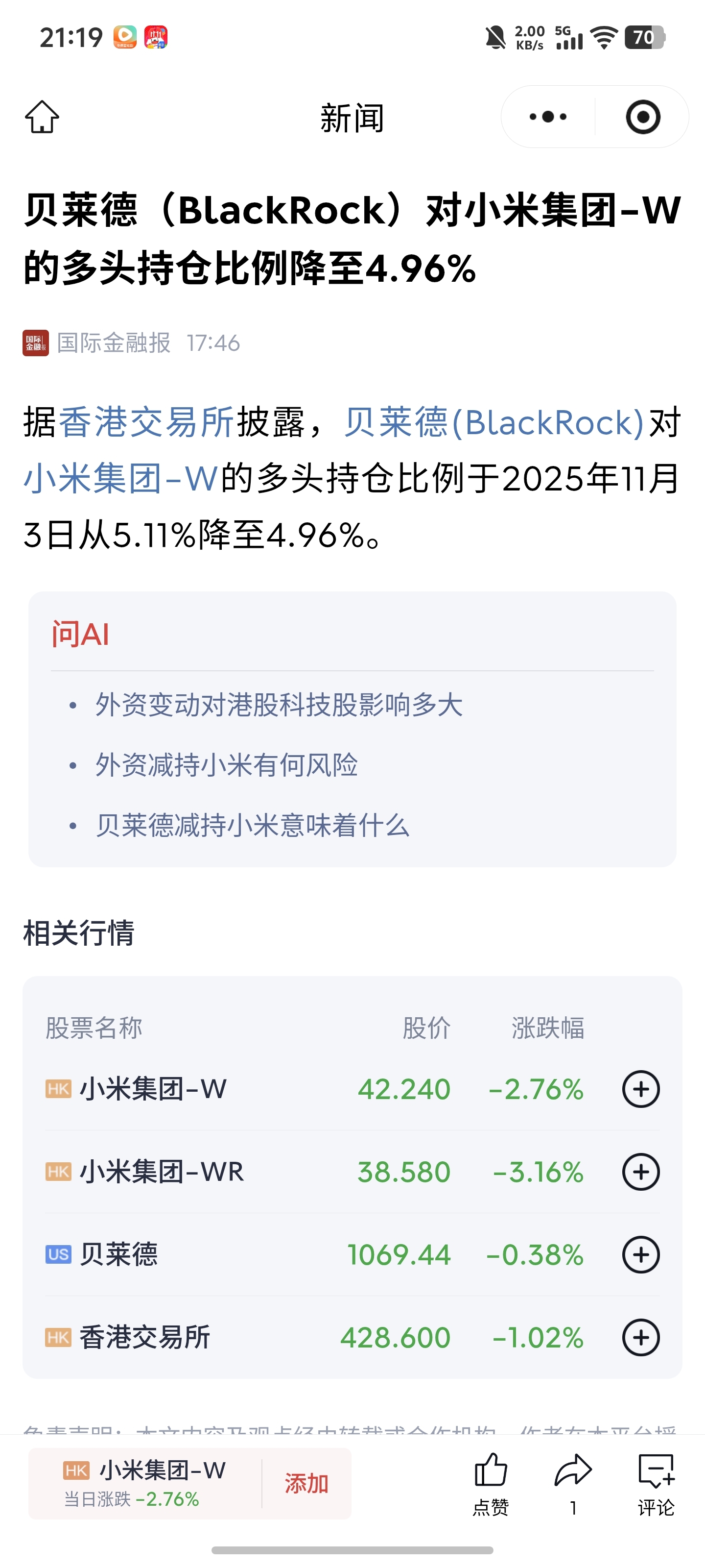 $小米集团-W(HK|01810)$ 贝莱德减持