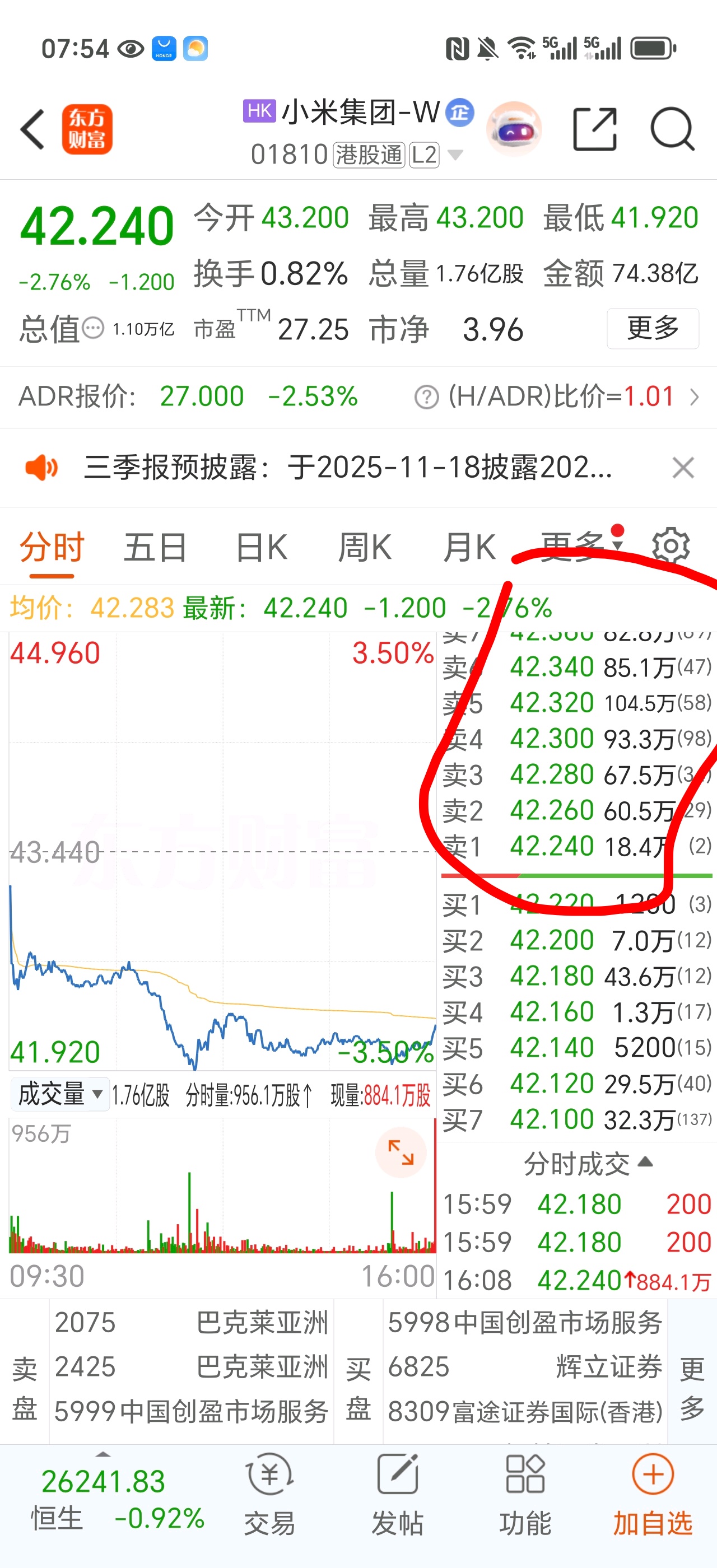 $小米集团-W(HK|01810)$ 周一要不要先减三分之二仓位,这卖单,亏麻了