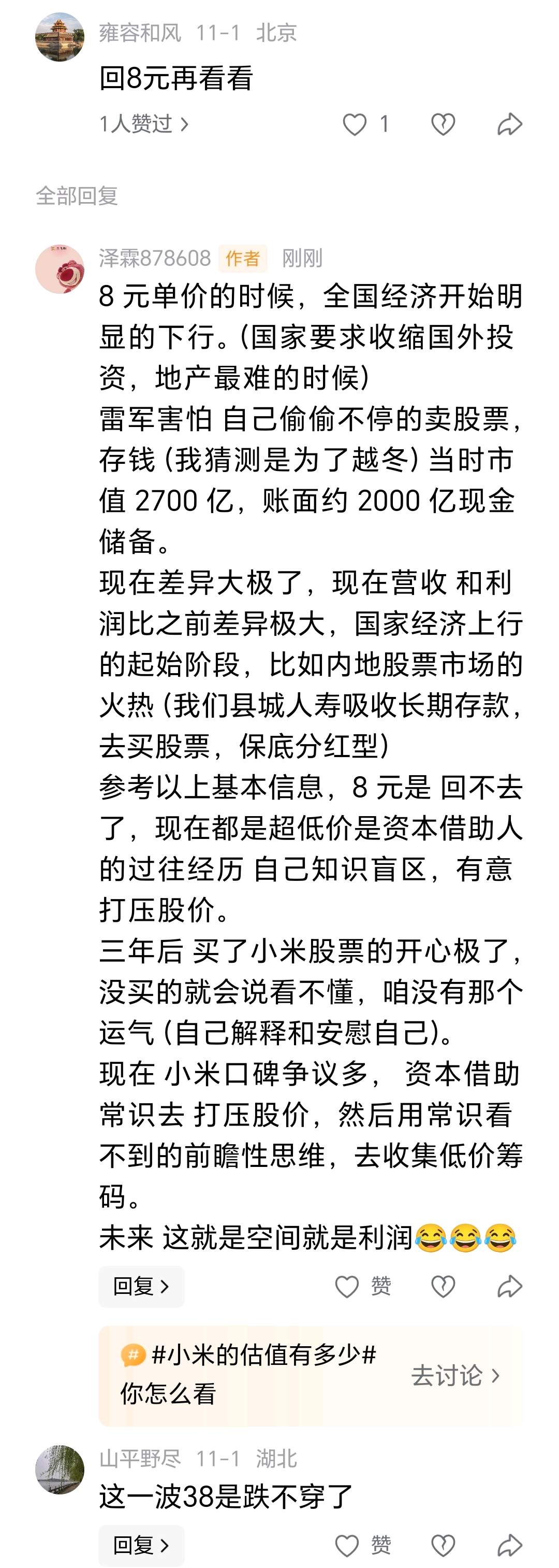 $小米集团-W(HK|01810)$ 不知道谁买的,还是越跌越买。虽然现在小米有浮动,有争议需要时间来成长。但是同比其他股票,例如京东 阿里 腾讯,茅台,当然还有小米,大家觉得谁翻倍的机会更大,未来成长空间大。北京市需要一个名片,政策也愿意实现房住不炒,做好供给侧的结构性改革的政策落地,实现经济动能的良好转换。北京市有一个报税大户(同时雷总说过配件只要京津冀有的,优先考虑使用,拉动经济发展)也就是说在这样的前提下,所有利于国家经济发展的企业都是好企业,不是抹黑就会有效果了,当然也能减少一部分销量或者劝退一些犹豫的人,因为相信所以遇见,安心持股 陪优秀的企业成长。享受发展过程中企业和经济发展趋势带来的红利