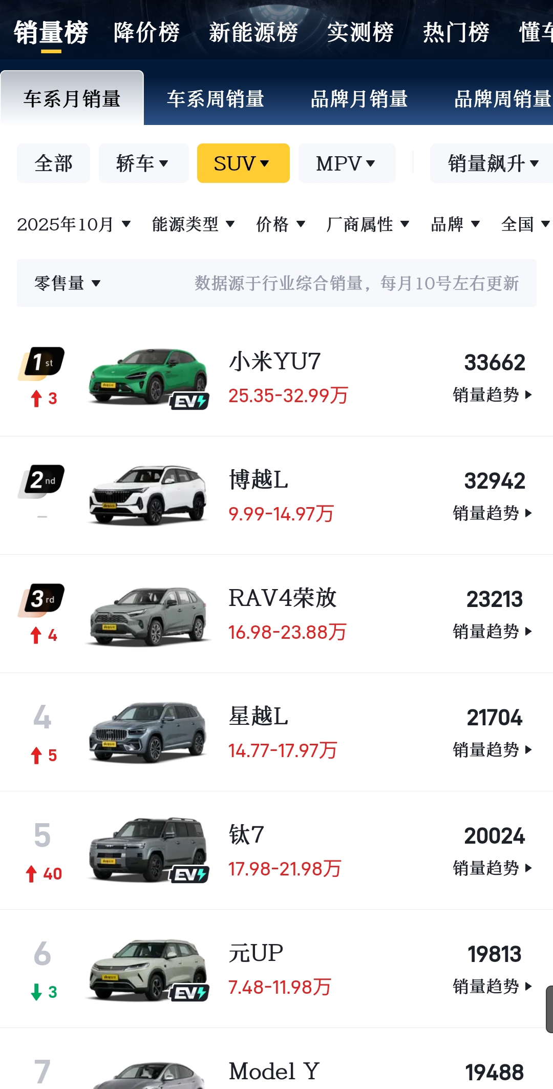 战报会撒谎,但战线不会。小米yu7稳居10月份suv销量那一栏的头把交椅。