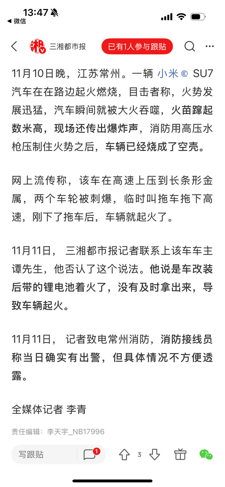 看事情确实不像是电池起火,不知道会不会有官方回应,让子弹飞会儿吧