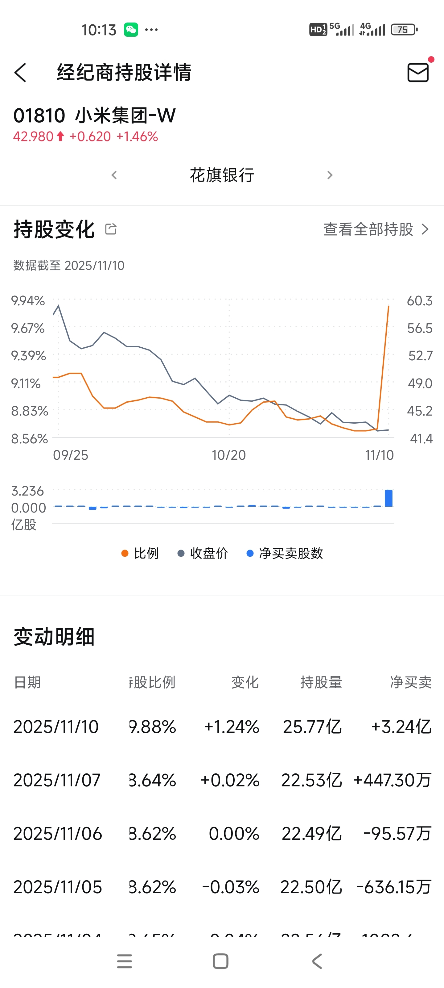 $小米集团-W(HK|01810)$ 花旗银行昨天买了3 24亿股