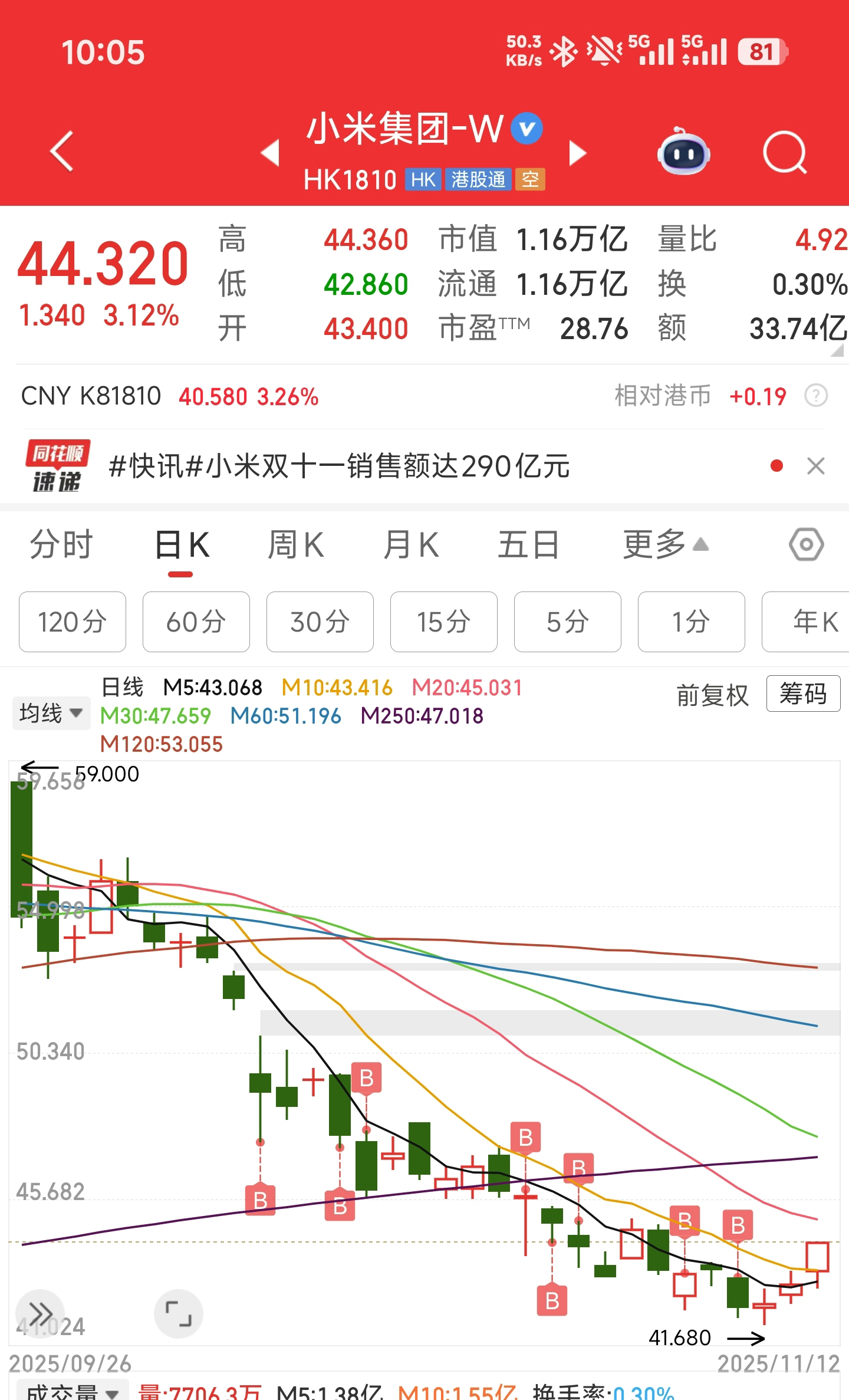 $小米集团-W(HK|01810)$ 准备跌1快加一次仓的,看来要告一段落了,空头们抓紧平仓吧,赚得够多了。