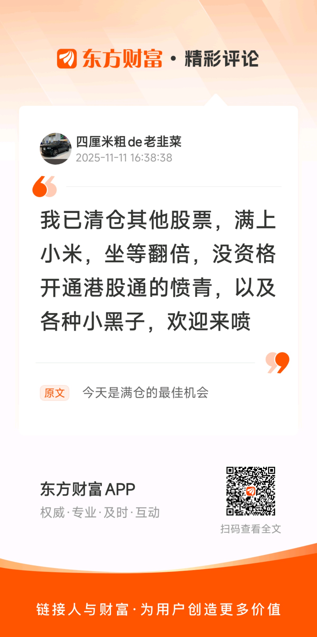 昨天我就多次发言这是入小米的最佳抄底机会那些小黑子愤青呢?出来走两步 天天看我加仓刻意问候我的呢,谢谢嗷,在我快要坚持不住时,是你们给了我坚定的信念让我代款加仓多亏你们//@四厘米粗de老韭菜 :我已清仓其他股票,满上小米,坐等翻倍,没资格开通港股通的愤青,以及各种小黑子,欢迎来喷