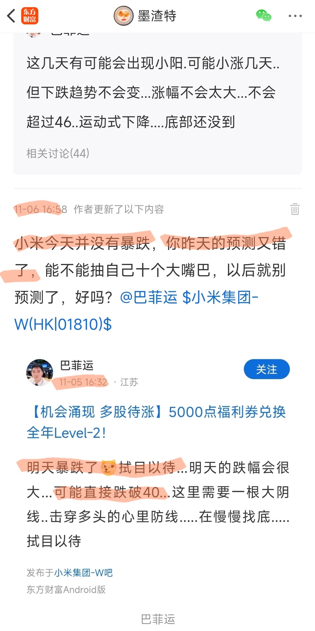 你没错过?你是年纪大失忆了还是怎么滴?那我替你还原一下11.5你预测11.6小米暴跌的情形@巴菲运 $小米集团-W(HK|01810)$ //@墨渣特 :@巴菲运 回答我这个问题很难吗?不想回答你也可以表个态,平常各种预测指点江山拭目以待的气势去哪里了?你作为投资高手能不能在这里表个态?//@墨渣特 :说具体明确一点,哪一天跌到40?@巴菲运 $小米集团-W(HK|01810)$
