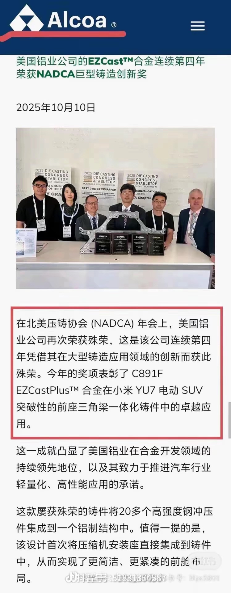 $小米集团-W(HK|01810)$ 小米的供应商美国铝业集团,而小米采用了这个材料。。。美国铝业官网都曝光了,所以小米也说自己得奖了