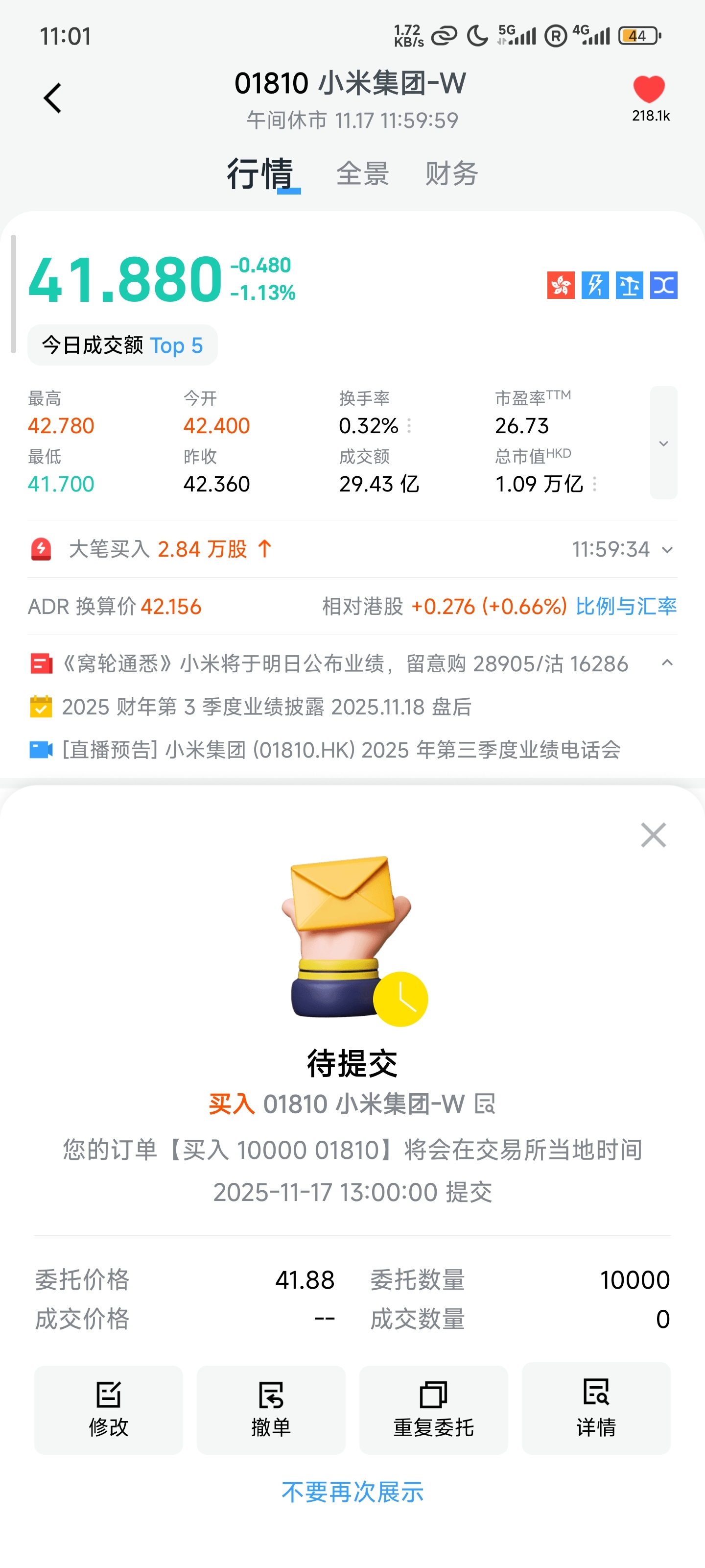 来个快进快出,42+卖出,手续费500港币(双向1000),只用涨0.10就够手