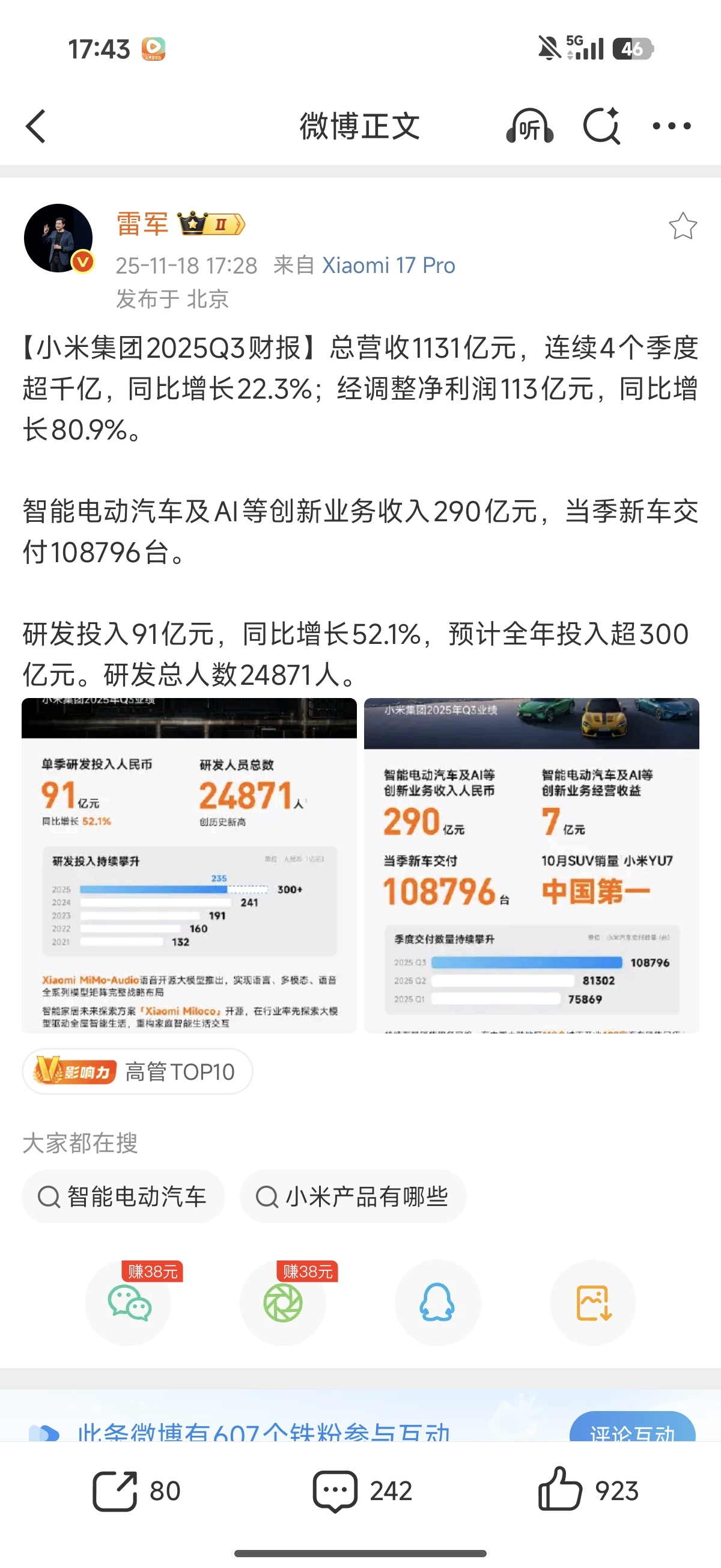 小米太强了,汽车已经实现季度盈利,3季度利润113亿,小米太强大了,做空的等着爆