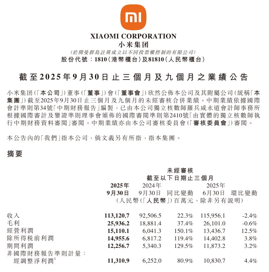 小米集团三季度经调整净利润同比大增80.9%!小米汽车业务首次实现单季盈利!雷军:研发投入91亿元