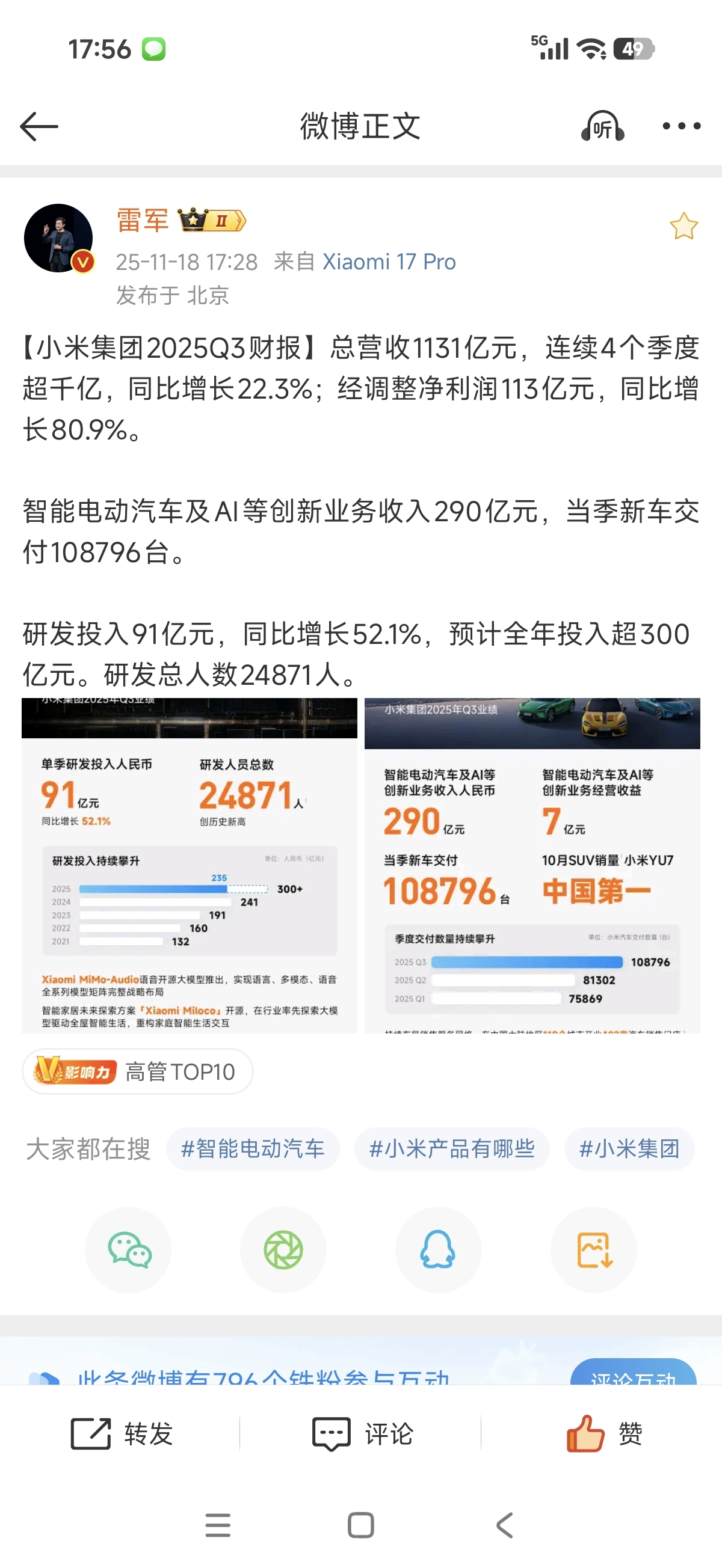 【小米集团2025Q3财报】总营收1131亿元,连续4个季度超千亿,同比增长22.3%;经调整净利润113亿元,同比增长80.9%。