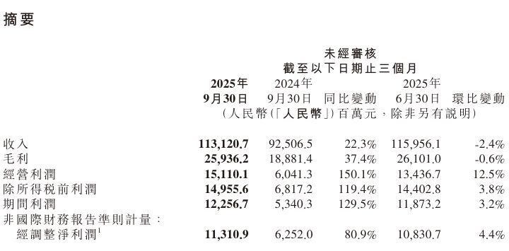 11月18日,小米集团(HK01810)发布了2025年第三季度(Q3)财报:当期总营收为1131.2亿元,同比增长22.3%,经调整净利润为113.1亿元,同比增长80.9%。手机×AIoT分部实现收入841亿元,智能电动汽车及AI等创新业务收入290亿元,小米汽车首次实现单季度经营盈利(毛利减去经营开支)。
