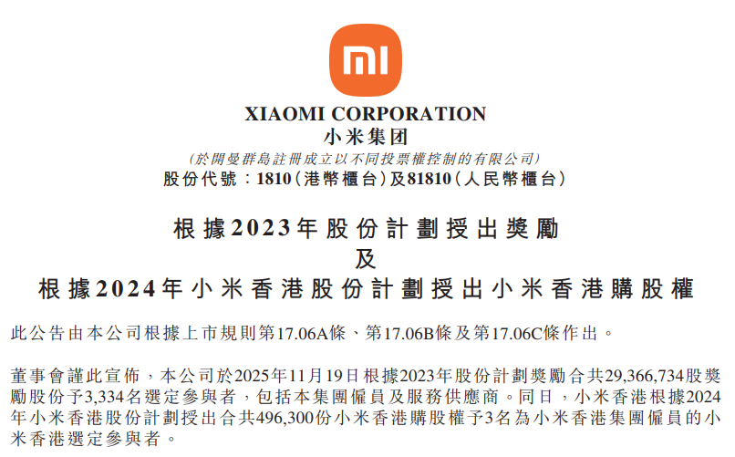 小米集团-W(01810.HK)于11月19日晚间发布公告,宣布根据2023年股份计划向3334名选定参与者奖励合共2936.67万股奖励股份,约占公司已发行股本的0.11%。若以小米11月19日收盘价每股38.82港元测算,本次授予股份的总价值约11.4亿港元。