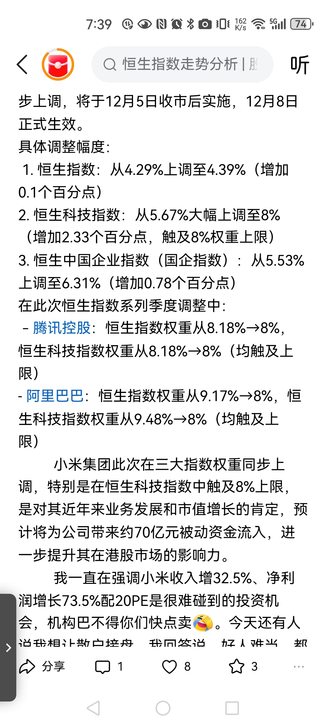 $小米集团-W(HK|01810)$ 小米最近半个月应该不会下跌了,接下来将会有70亿元被动资金