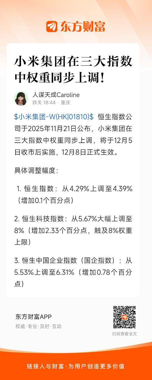 $小米集团-W(HK|01810)$ 恒生指数公司于2025年11月21日公布,小米集团在三大指数中权重同步上调,将于12月5日收市后实施,12月8日正式生效。