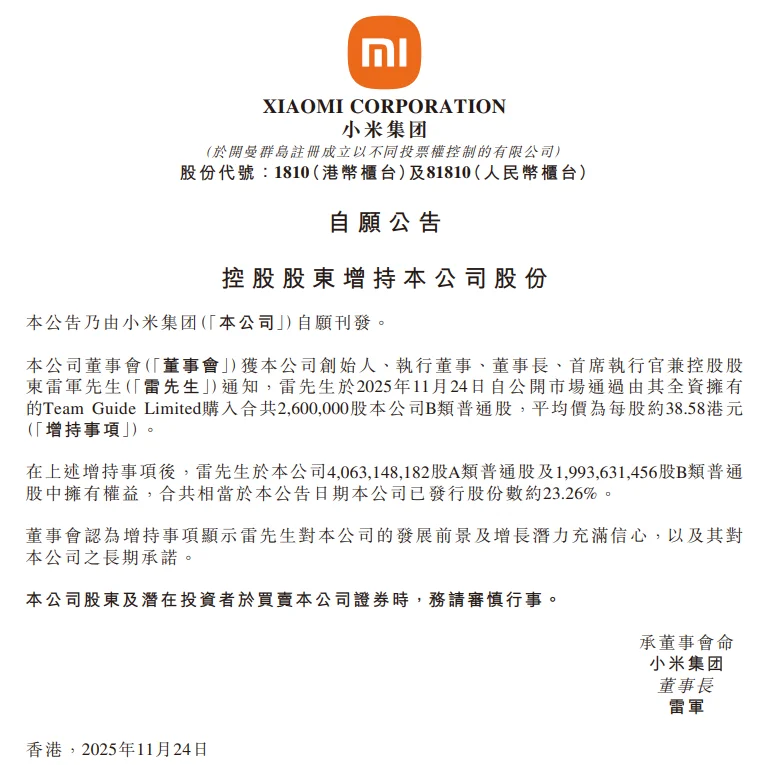 小米集团股价强势收复40港元!雷军出手1亿港元“抄底”,持股比例增至23.26%