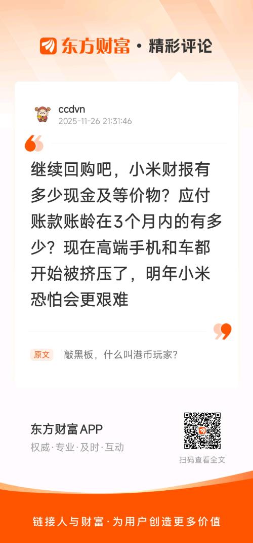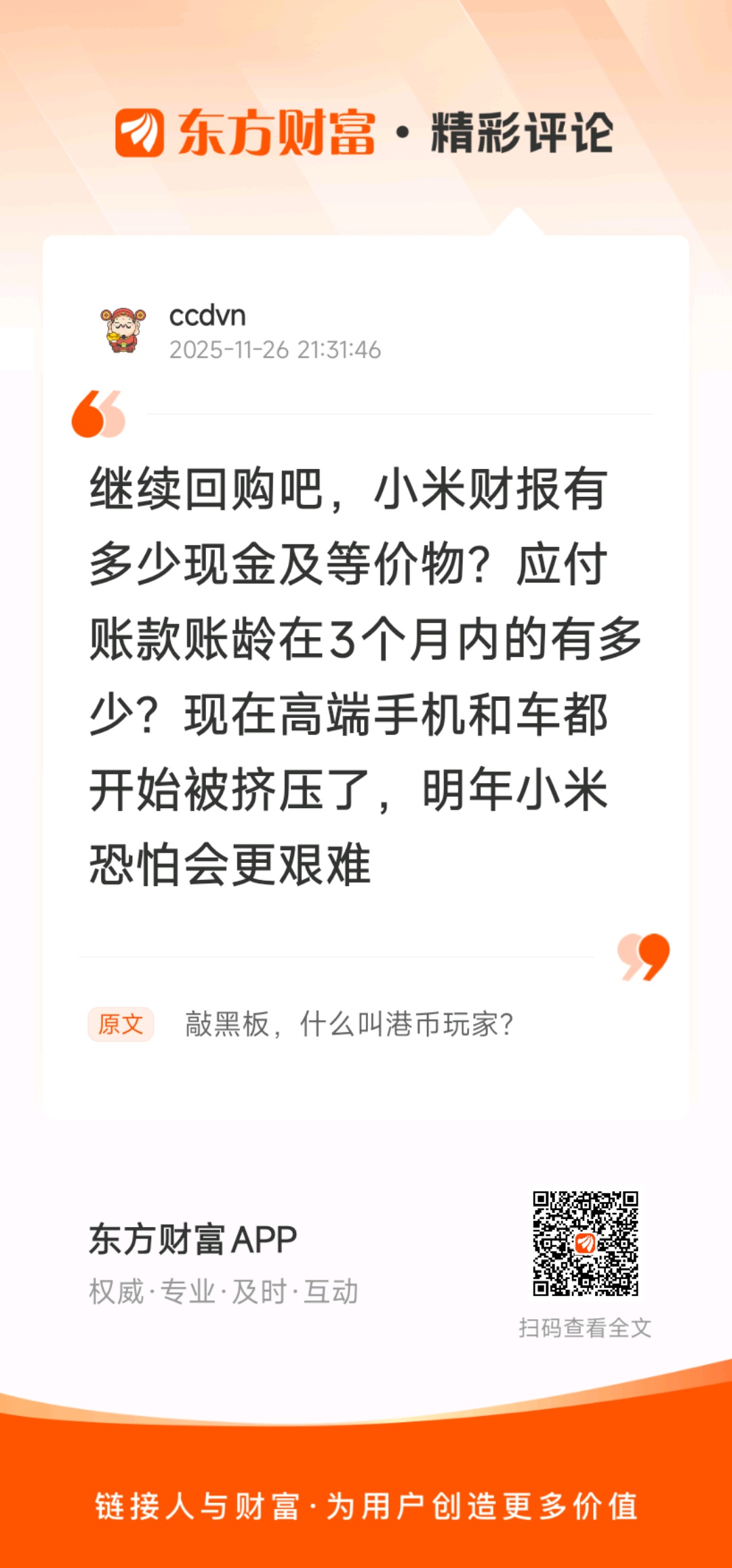 //@ccdvn :继续回购吧,小米财报有多少现金及等价物?应付账款账龄在3个月内的有多少?现在高端手机和车都开始被挤压了,明年小米恐怕会更艰难 $小米集团-W(HK|01810)$@顺势而为御风而行