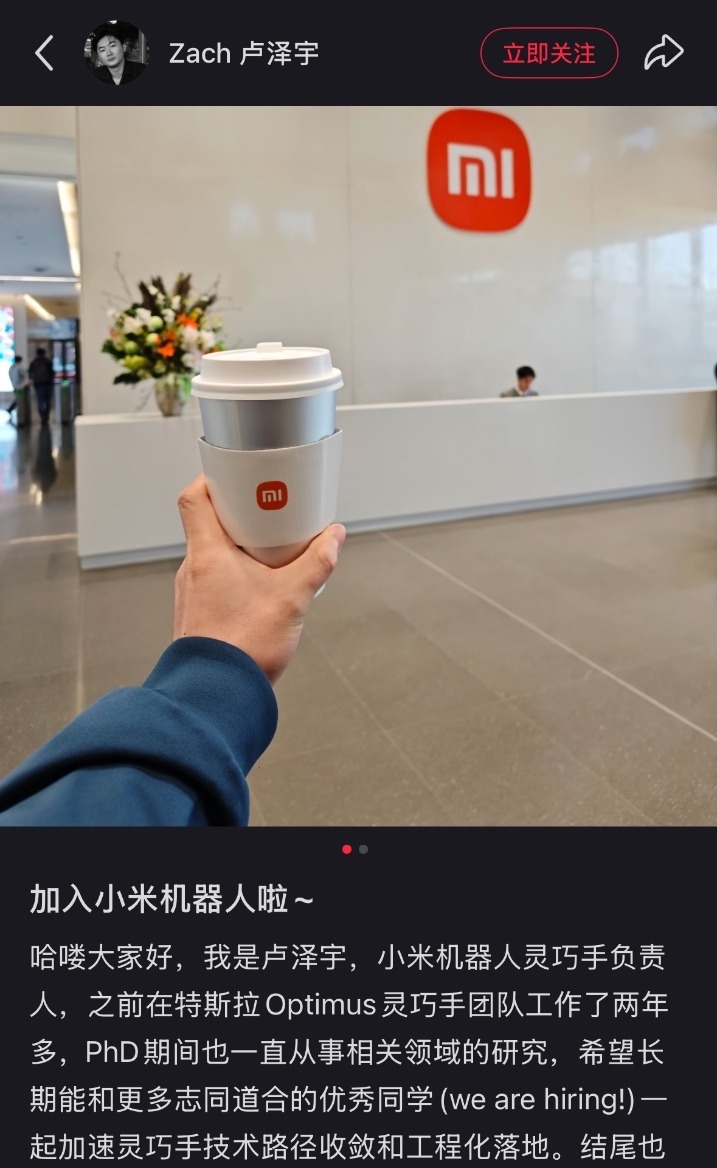 在个人媒体上,卢泽宇确认了入职小米的消息,并确表示将带领团队加速灵巧手技术的“落地”,同时为小米公开招募机器人领域技术人才加入。