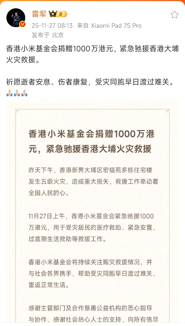 香港小米基金会捐赠1000万港元,紧急驰援香港大埔火灾救援。