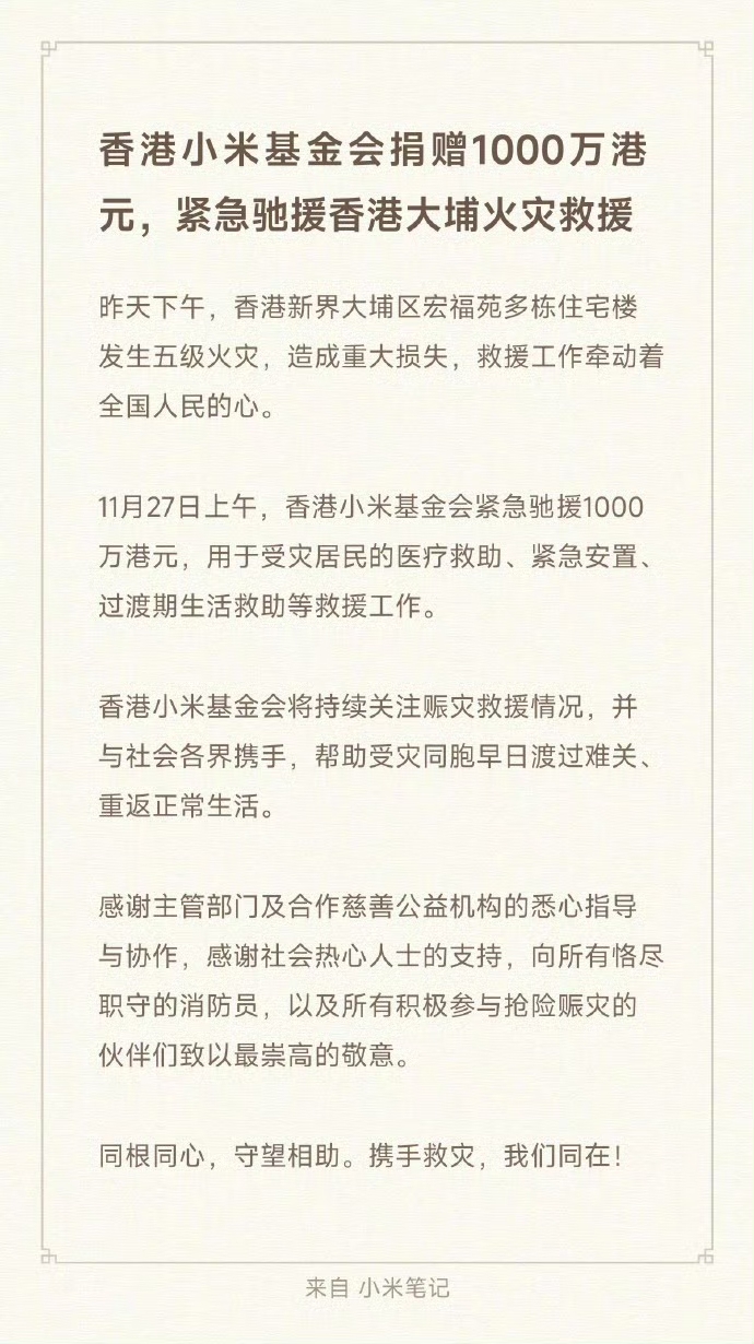 $小米集团-W(HK|01810)$ 大火无情,人间有爱!