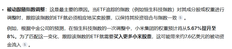 $小米集团-W(HK|01810)$ 基金的份额调整,会造成小米的被动买入,按照中金预测,会有7.6亿美金的被动买入,事实上可能会比这个还要多。保守估计被动涨5%左右。