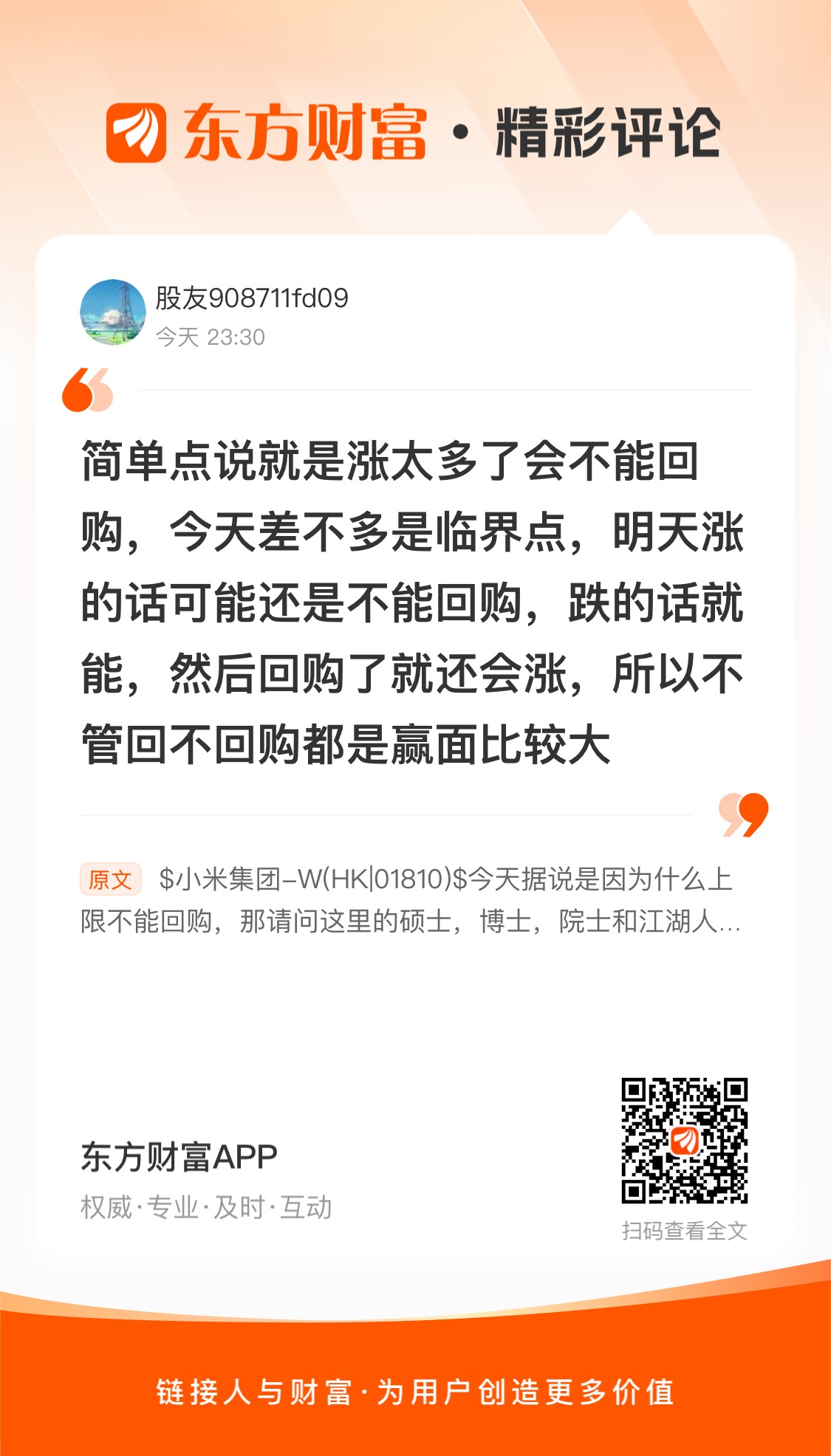 $小米集团-W(HK|01810)$  今天据说是因为什么上限不能回购,那请问这里的硕士,博士,院士和江湖人士,明天可以回购吗?