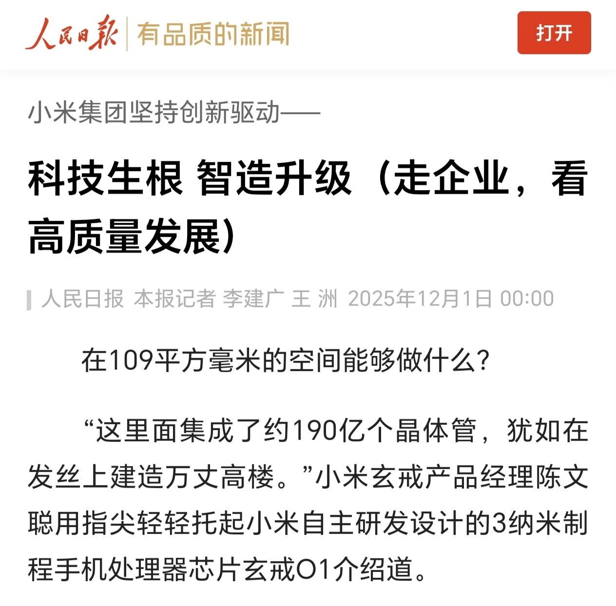 人民日报今天的报道:创新是小米夯实向上生长的坚实底座。2024年,小米集团研发投