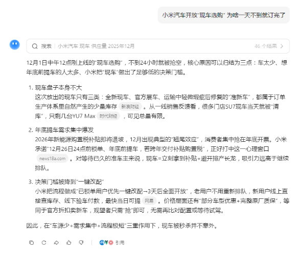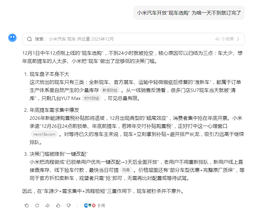 问的kimi:小米汽车开放“现车选购”为啥一天不到就订完了。我还想着到3号能否挑