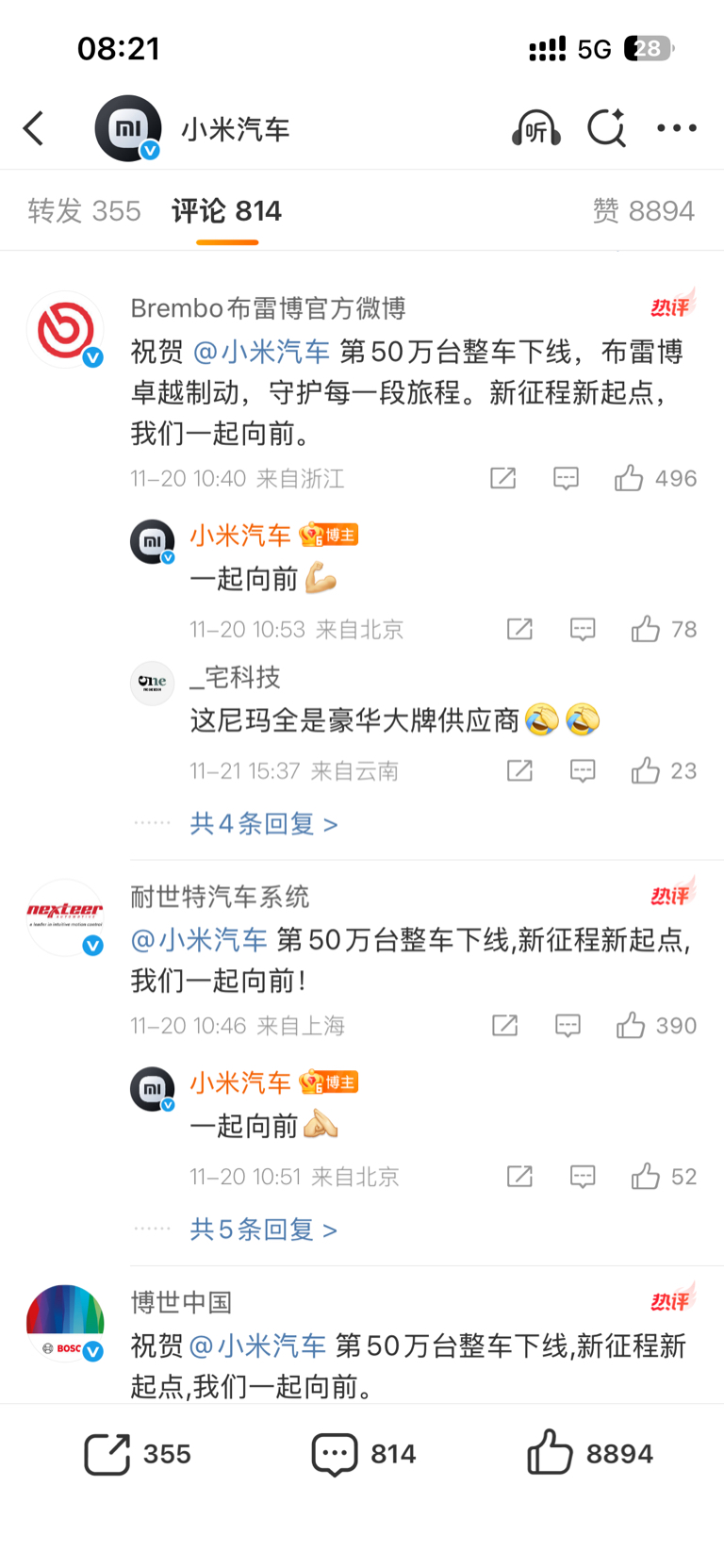 小米汽车50w下线的微博下面全是顶级汽车配件供应商的祝贺