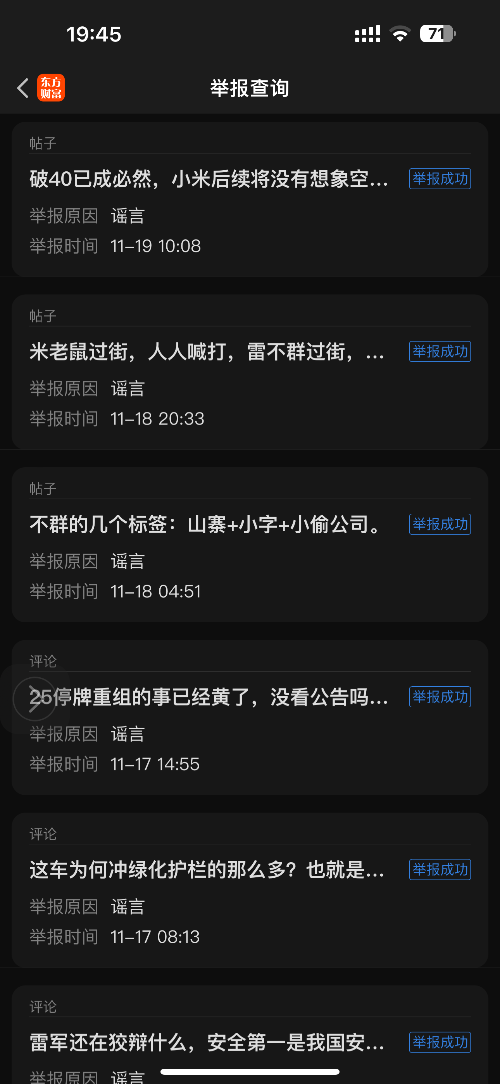 我昨天举报了6个专门黑小米的用户,把恶毒的帖子和评论一一截图至12377(12377用电脑操作起来非常丝滑),配合国家的网络晴朗行动。目前雪球和同花顺也在逐个围剿,有看到的米粉我们一起加油,人人一份力量让友商回老家种田。